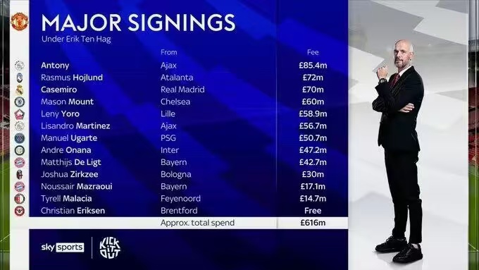 据统计,滕哈格执教红魔的2年半时间内,共计引入了13名球员,是曼联队史获得引援投入最多的主帅,也是同时期净支出第二多的英超球队(仅次于切尔西)。这13名球员分别是: