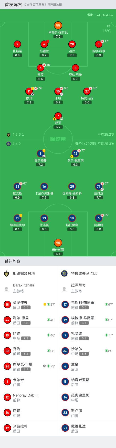 上半场补时第3分钟,耶路撒冷贝塔球队马塞兰吃到红牌。