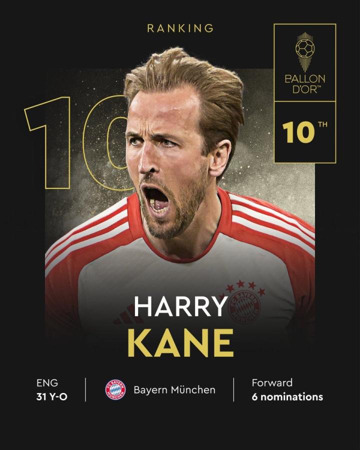 2024年金球奖排名正在陆续揭晓中,凯恩排名第10,上赛季,凯恩代表拜仁出场45次,打入44球,送出12次助攻。