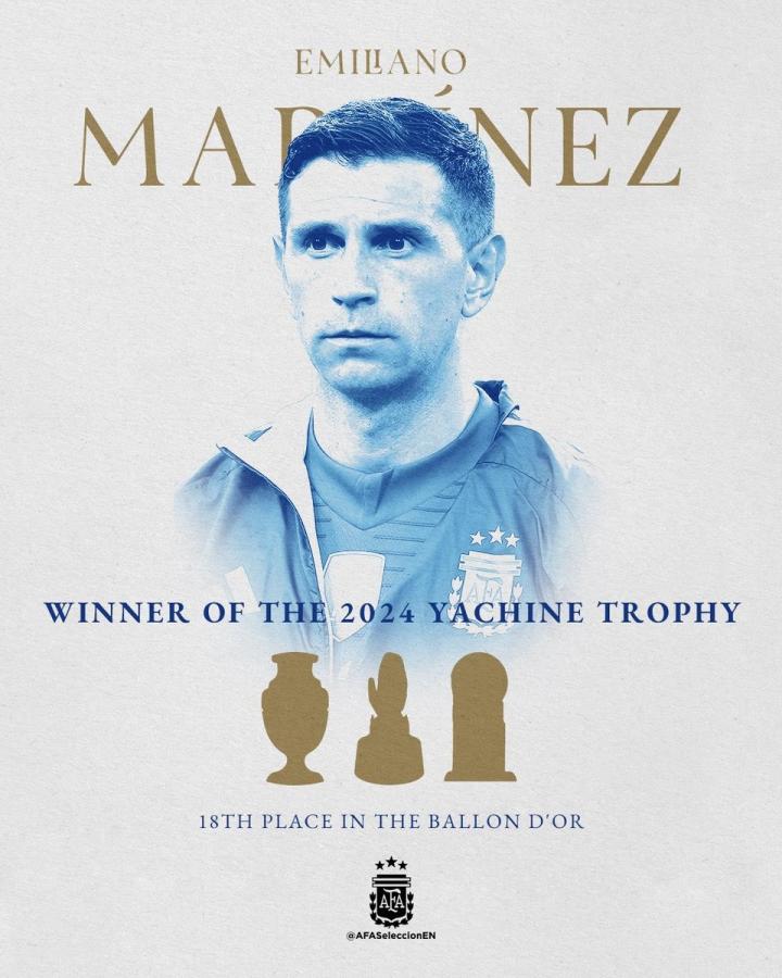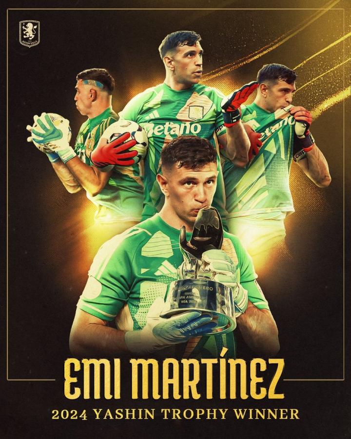 2024年金球奖颁奖典礼上,维拉的阿根廷门将达米安-马丁内斯蝉联雅辛奖,维拉官方和阿根廷国家队官方发布海报送上祝贺。