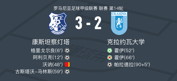 第59分钟,康斯坦察灯塔球员拉达斯拉韦斯库助攻古斯塔沃-马林斯打入一球。
