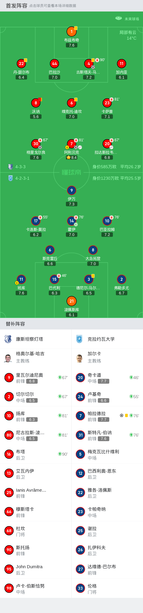 第12分钟,康斯坦察灯塔球员阿利贝克打入一球。