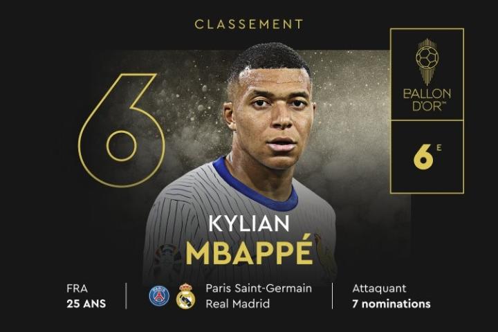 2024年金球奖排名正在陆续揭晓,姆巴佩排名第六,这位法国前锋职业生涯金球奖最高排名曾达到第三。