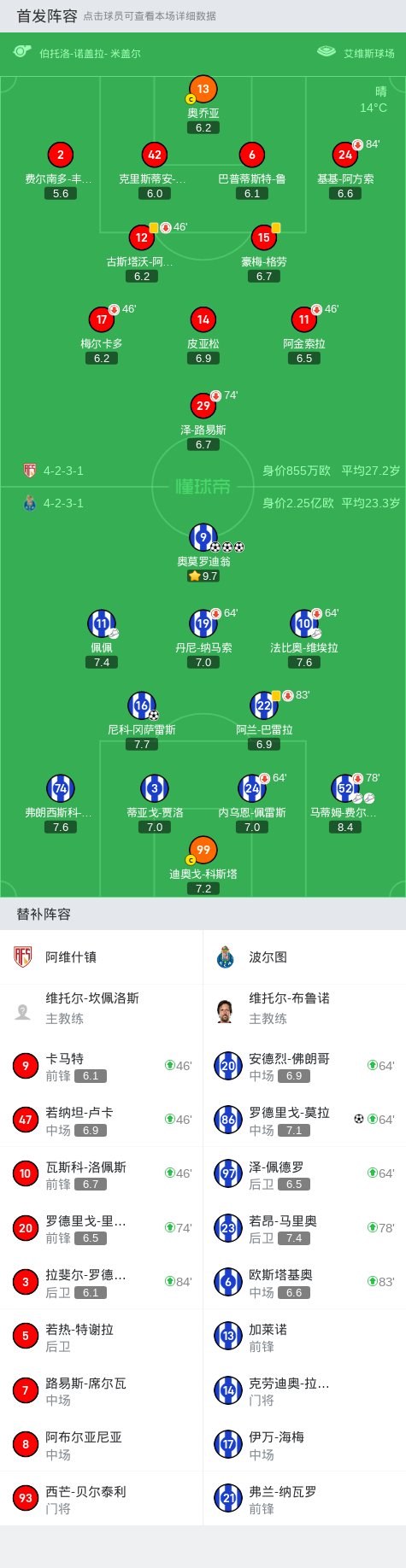 波尔图5-0客胜阿维什镇,奥莫罗迪翁上演帽子戏法