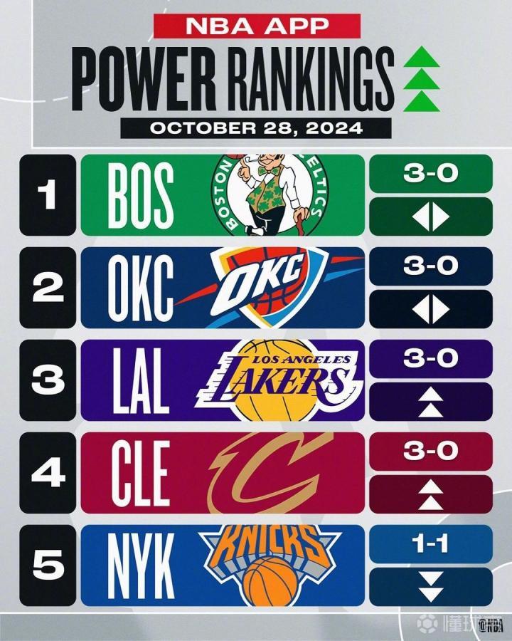 北京时间10月29日,NBA官方公布最新一期球队战力榜,卫冕冠军波士顿凯尔特人稳居榜首,雷霆继续位列第二,三连胜的湖人暴涨16位来到第三。