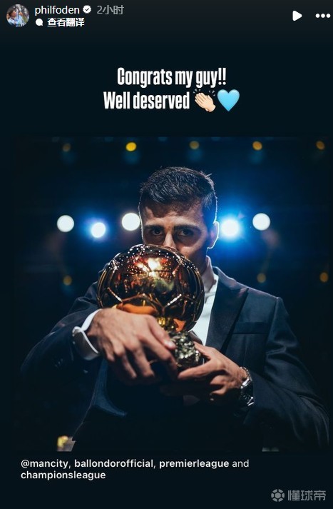 福登转发了曼城官方晒出了罗德里亲吻金球奖奖杯照片,并配文:“恭喜你,兄弟!!你配得上得奖”。