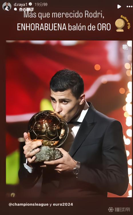 拉亚先是晒出了罗德里赢得金球奖的照片,并配文:“实至名归的罗德里,恭喜你获得金球奖。”