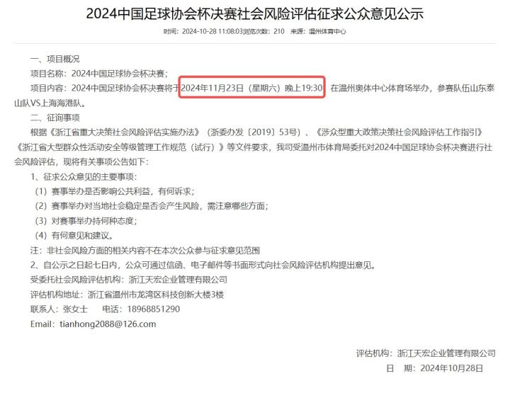 10月28日,温州市体育局发布的《2024中国足球协会杯决赛社会风险评估征求公众意见公示》公告中显示,今年足协杯决赛将于11月23日19:30开赛。