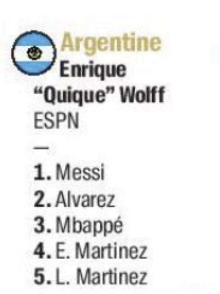 RMC体育报道称,恩里克-沃尔夫曾代表阿根廷国家队出场27次,2023年金球奖投票中,他的投票顺序为梅西、阿尔瓦雷斯、姆巴佩、达米安-马丁内斯和劳塔罗-马丁内斯。他在前五名中选出了四位入围候选名单的阿根廷球员。
