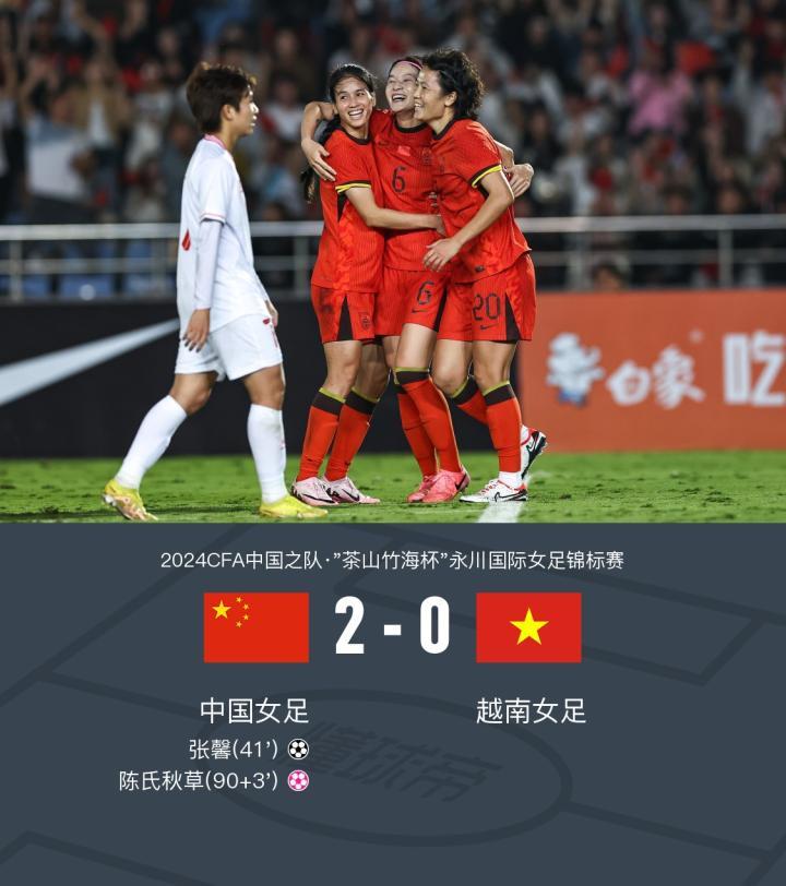 在2024CFA中国之队·"茶山竹海杯"永川国际女足锦标赛中,中国女足迎战越南女足。比赛中,中国队的刘靖送出精彩助攻,张馨成功破门,为球队取得领先。比赛接近尾声时,越南队的陈氏秋草不慎自摆乌龙,进一步扩大了中国队的领先优势。最终,中国女足以2-0战胜越南女足,取得胜利。