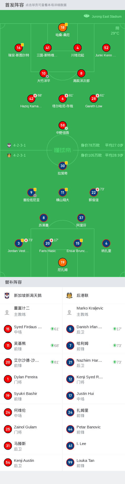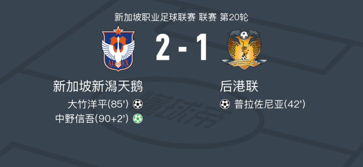 在新加坡职业足球联赛第20轮的较量中,新加坡新潟天鹅坐镇主场迎战后港联。比赛中,后港联的普拉佐尼亚率先为球队取得进球。随后,新加坡新潟天鹅的大竹洋平扳平比分。比赛接近尾声时,中野信吾通过点球为新加坡新潟天鹅锁定胜局。最终,新加坡新潟天鹅以2-1战胜后港联。