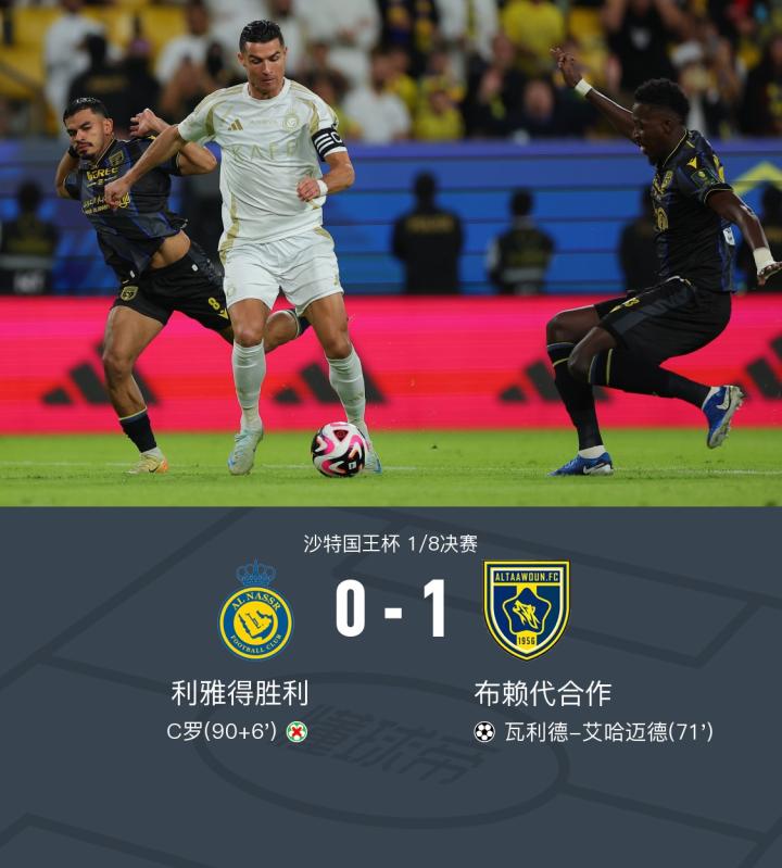 在沙特国王杯1/8决赛中,利雅得胜利迎战布赖代合作。比赛中,布赖代合作的瓦利德-艾哈迈德在费萨尔-法伊尔的助攻下头槌打破僵局。补时第6分钟,C罗主罚点球打高,错失绝平。最终,利雅得胜利0-1不敌布赖代合作,遭淘汰。