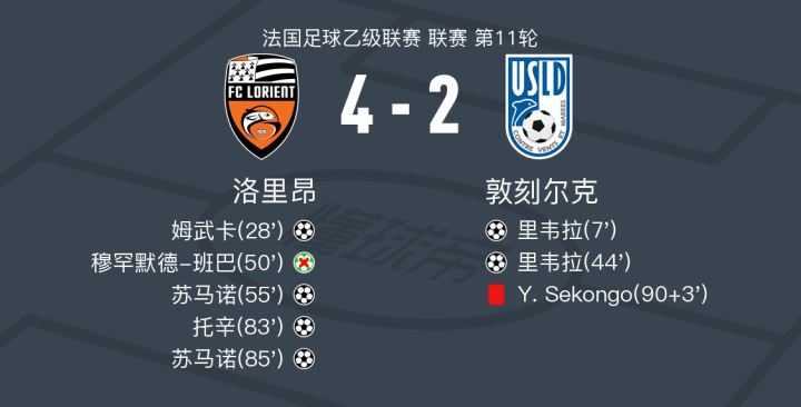 洛里昂4-2逆转敦刻尔克,苏马诺两球,托辛破门