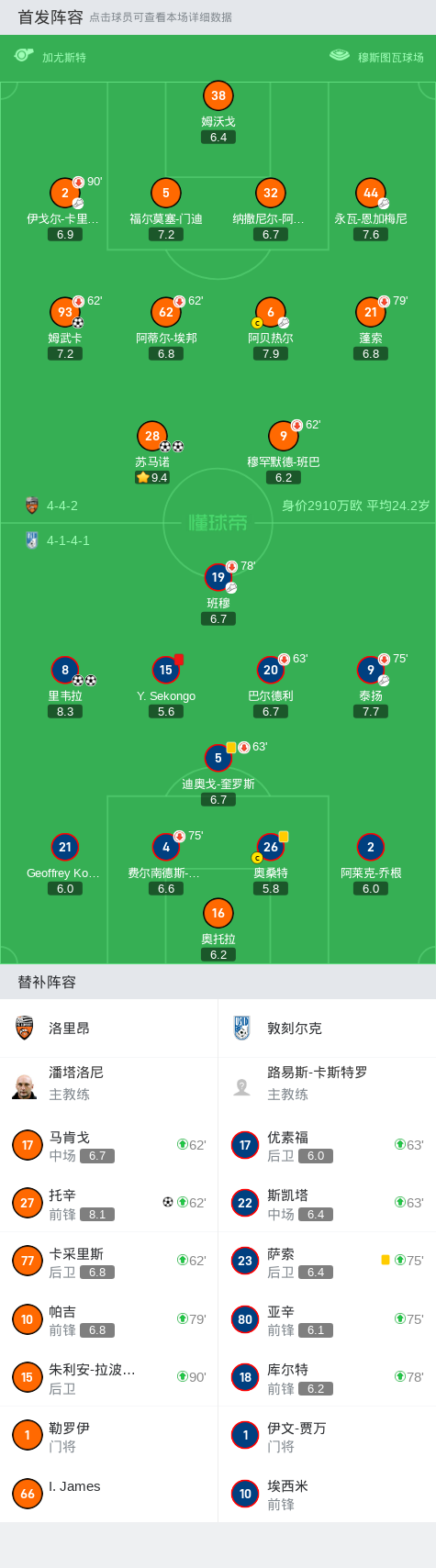 在一场激动人心的法国足球乙级联赛中,洛里昂坐镇主场迎战敦刻尔克。比赛伊始,敦刻尔克的里韦拉在队友的精妙传球下率先破门,为客队取得领先。洛里昂迅速做出回应,姆武卡接到队友的助攻,将比分扳平。随后,里韦拉再次展现出色的射门能力,为敦刻尔克再度取得领先。 下半场,洛里昂获得点球机会,但未能把握住。尽管如此,洛里昂并未气馁,苏马诺在队友的助攻下成功破门,再次将比分扳平。比赛进入尾声阶段,托辛和苏马诺接连进球,帮助洛里昂反超比分。比赛临近结束时,敦刻尔克的一名球员被罚下场,最终洛里昂以4-2的比分战胜敦刻尔克,取得了这场比赛的胜利。