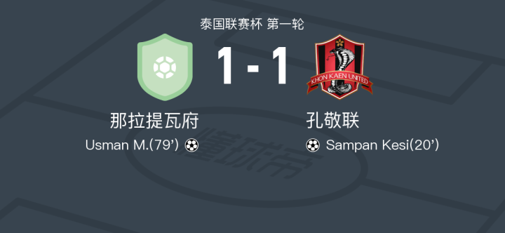 在泰国联赛杯第一轮的较量中,那拉提瓦府迎战孔敬联。比赛中,孔敬联的Sampan Kesi率先为球队取得进球,展现了出色的个人能力。随后,那拉提瓦府的Usman M.也不甘示弱,为球队扳平比分。最终,双方以1-1握手言和,比赛结果平分秋色。