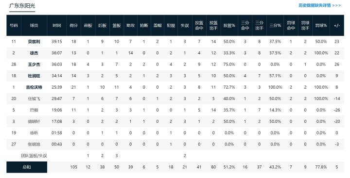 广东东阳光吉伦沃特21分5板2助,达柳斯-贝兹利18分7板6助,王少杰18分4板,胡明轩出场17分钟拿到3分,巴顿14投5中拿到11分。