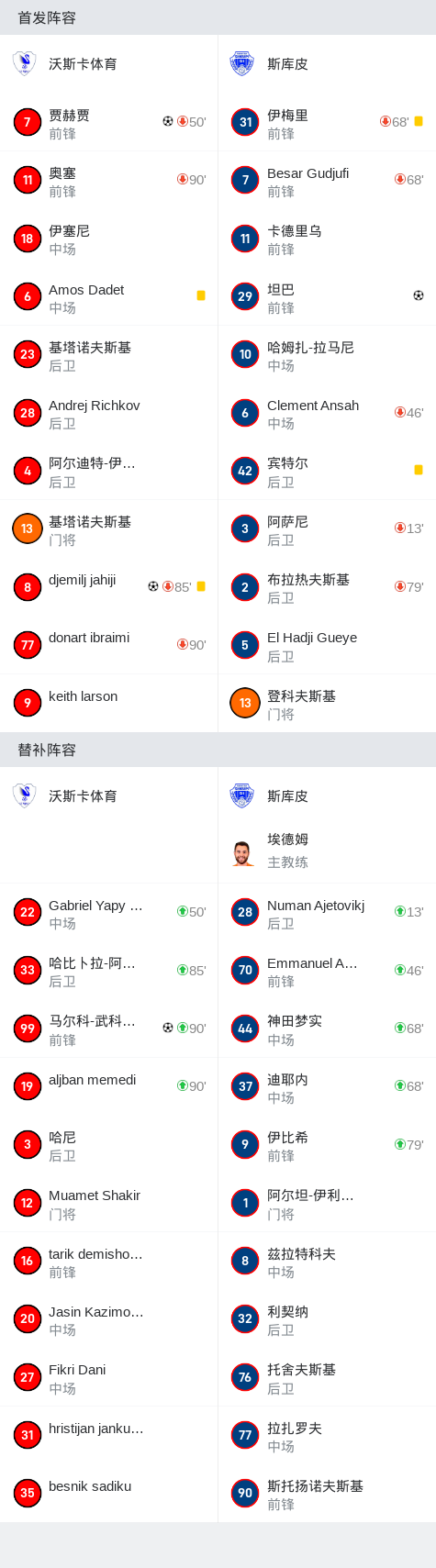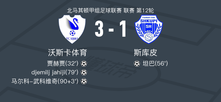 在北马其顿甲组足球联赛第12轮的比赛中,沃斯卡体育坐镇主场迎战斯库皮。比赛中,沃斯卡体育的贾赫贾率先为球队取得领先。随后,斯库皮的坦巴扳平比分。沃斯卡体育的djemilj jahiji再次帮助球队取得领先,紧接着,马尔科-武科维奇锁定胜局。最终,沃斯卡体育以3比1战胜斯库皮,取得了本场比赛的胜利。