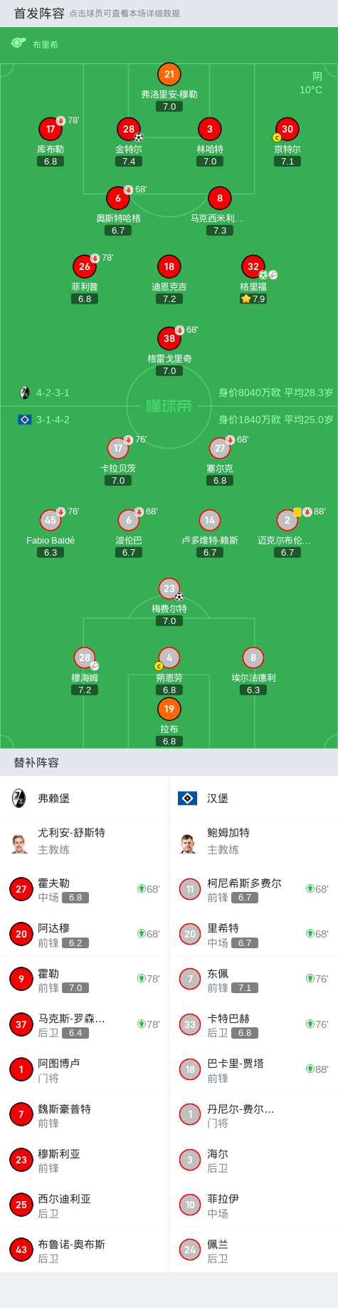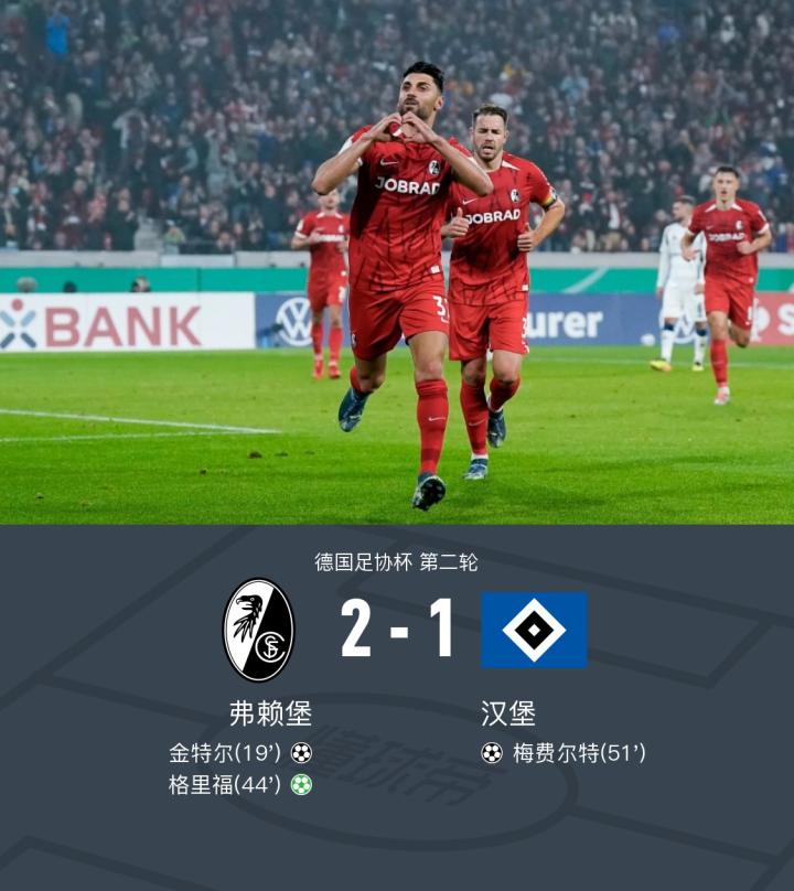 德国杯弗赖堡2-1汉堡,格里福传射,金特尔建功战报bot2024-10-31 02:54在德国足协杯第二轮的较量中,弗赖堡迎战汉堡。比赛中,弗赖堡的格里福表现出色,他先是助攻金特尔成功破门,随后又通过点球为球队再添一分。汉堡方面,梅费尔特在穆海姆的助攻下打入一球,为球队扳回一城。最终,弗赖堡以2-1战胜汉堡,取得胜利。点击查看本场比赛详细数据>>点击查看德国杯完整积分榜>>精彩瞬间第19分钟,弗赖堡球员格里福助攻金特尔打入一球。第44分钟,弗赖堡球员格里福罚入点球。第51分钟,汉堡球员穆海姆助攻梅费尔特打入一球。球队阵容技术统计展开更多