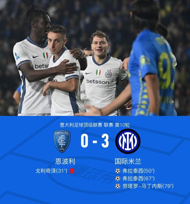 在意大利足球顶级联赛第10轮的较量中,恩波利坐镇主场迎战国际米兰。上半场戈利奇泽踩踏小图拉姆犯规,VAR介入后裁判出示红牌。下半场弗拉泰西禁区内射门发生折射,球击中门框弹进球门,之后劳塔罗脚后跟回做,弗拉泰西低射完成双响,之后瓦斯奎兹出球失误,巴雷拉助攻劳塔罗破门。最终国米3-0客胜十人恩波利。
