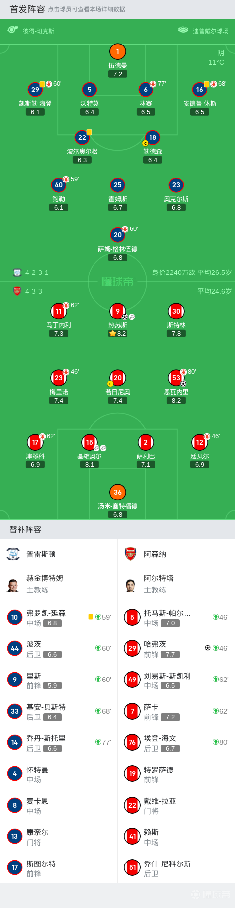 第23分钟,热苏斯禁区凌空抽射破门,阿森纳1-0领先