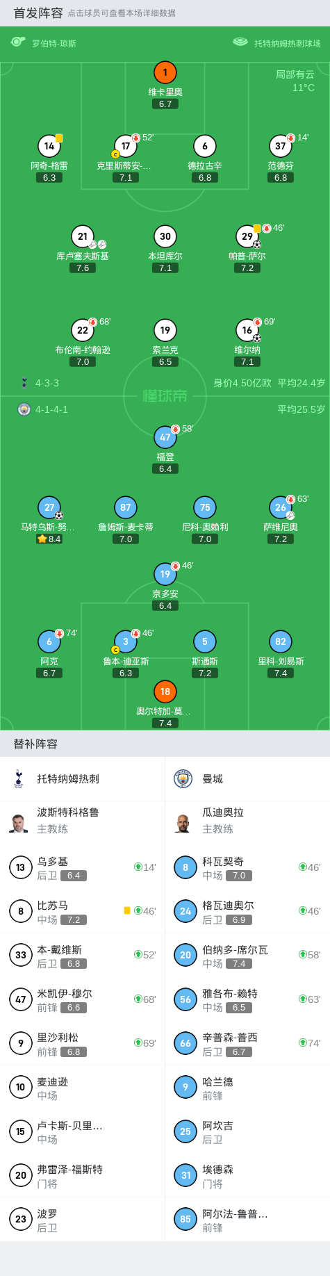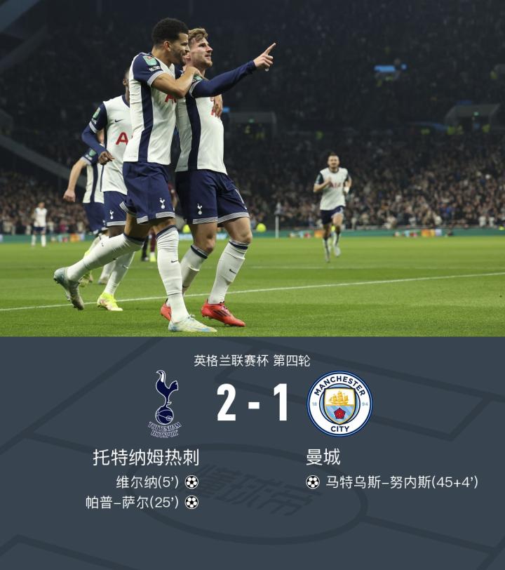 北京时间10月31日04:15,英联杯第四轮焦点战,托特纳姆热刺坐镇主场托特纳姆热刺球场迎战曼城,本场主裁判为罗伯特-琼斯。比赛中,库卢塞夫斯基表现出色,先后助攻维尔纳和帕普-萨尔破门,随后努内斯为曼城扳回一城。本场范德芬与萨维尼奥先后伤退。最终,热刺以2-1战胜曼城,成功晋级。