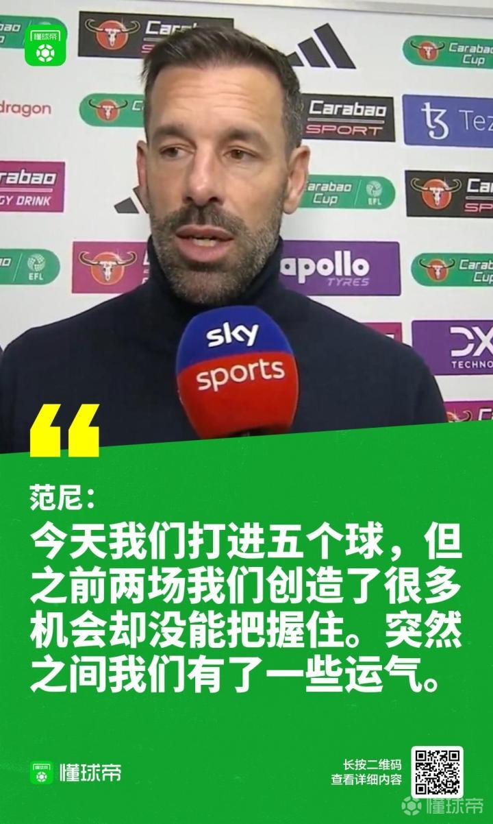 赛后范尼接受了天空体育的采访:“我必须说我们也得到了一些运气眷顾,不过我为卡塞米罗、加纳乔以及布鲁诺-费尔南德斯感到高兴。今天我们打进五个球,但之前在对阵西汉姆联和费内巴切的时候,我们创造了很多机会却没能把握住。突然之间,我们有了一些运气,这让这个夜晚变得非常精彩。”