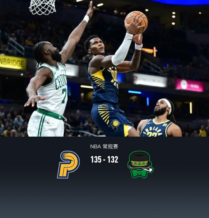 北京时间10月31日NBA 常规赛,印第安纳步行者对阵波士顿凯尔特人。半场步行者67-57凯尔特人,第四节还剩15秒时,塔图姆命中了绝平三分,哈利伯顿也未能命中绝杀球,比赛进入加时。在加时赛中,西亚卡姆命中三分准绝杀,杰伦-布朗错失两次进攻机会,最终步行者135-132凯尔特人。印第安纳步行者马图林30分11板4助,西亚卡姆29分11板5助;波士顿凯尔特人塔图姆37分8板4助,杰伦-布朗25分6板5助。
