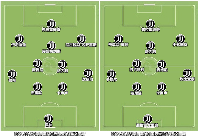 (图)赛季开打至今表现最出色的两场比赛,尤文的首发阵容只有三处相同点,伤病的影响可见一斑。