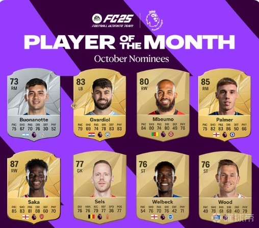 北京时间10月31日,英超官方公布了10月最佳球员的候选名单,其中格瓦迪奥尔、帕尔默、萨卡、姆贝乌莫、克里斯-伍德、维尔贝克在列