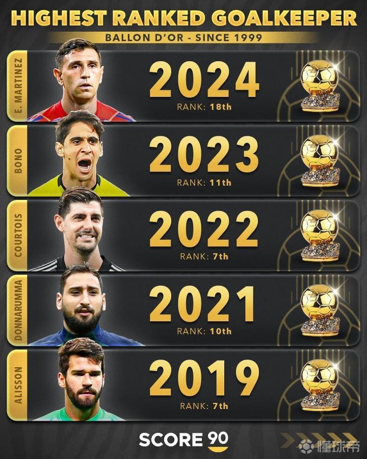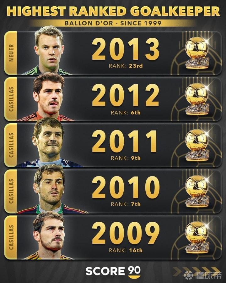 2024年金球奖评选近日落下帷幕,门将位置最高排名是达米安-马丁内斯,他获得了第18名。媒体score90统计了自1999年以来历届金球奖位次最高的门将。其中进入前三甲的门将有:2014年第三名的诺伊尔,2006年第二名的布冯,以及2001年、2002年均获得第三名的卡恩。而卡西利亚斯在2008-2012年连续5年位列金球奖门将位置的最高排名。