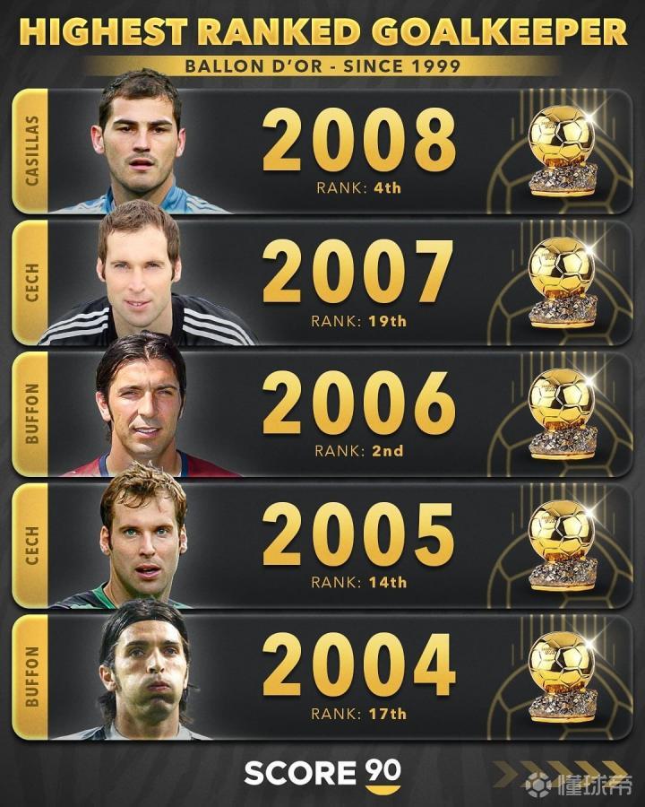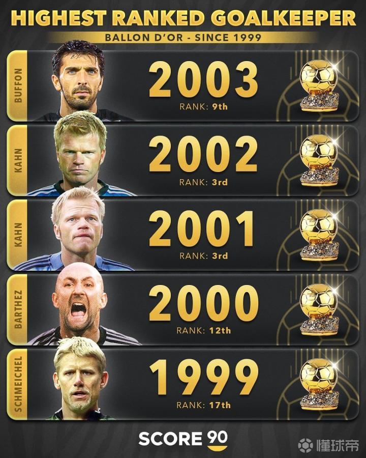 99年以来历届金球奖门将最高排名:06年布冯第2,卡恩两次第3
