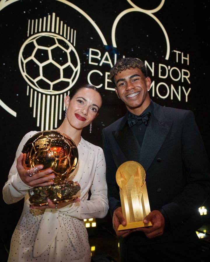 2024年金球奖颁奖典礼,巴萨女足球员邦马蒂收获女足金球奖,亚马尔则获得科帕奖。邦马蒂分享了一段她和亚马尔之间的趣事,她询问亚马尔是否想摸一摸金球,但亚马尔拒绝了。