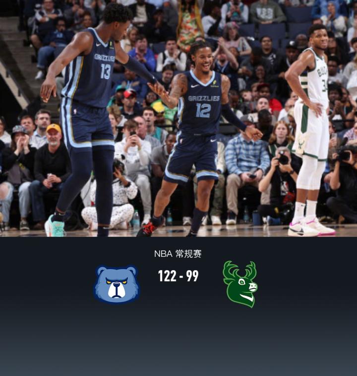 第四节灰熊阿尔达马拿下6分,雄鹿字母哥拿下13分,最终灰熊122-99战胜雄鹿