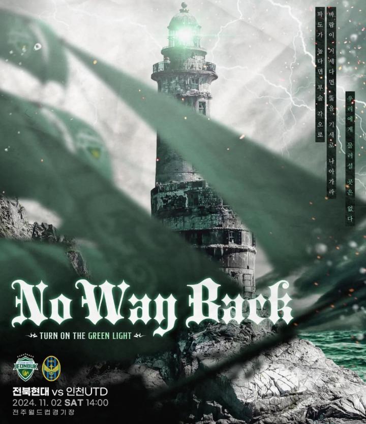 当地时间11月2日下午2点,韩国豪门球队全北现代就将在全州世界杯体育场与仁川联队进行K联赛保级组第36轮比赛。球队社媒发布了一张意味深长的海报并配文:背水一战(No way back)。