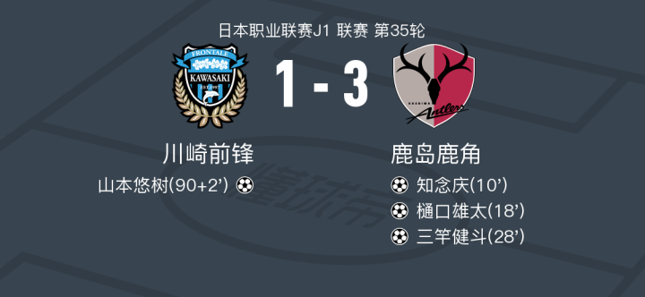 北京时间11月1日日本职业联赛J1 联赛 第35轮,川崎前锋主场对阵鹿岛鹿角。川崎前锋山本悠树破门。鹿岛鹿角知念庆破门,樋口雄太破门,三竿健斗破门。最终比分川崎前锋 1-3 鹿岛鹿角。