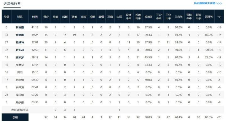 天津先行者马库斯-拉维特26分6板5助,林庭谦16分2板6助1断,大卫-詹姆斯15分19板6助2断2帽;