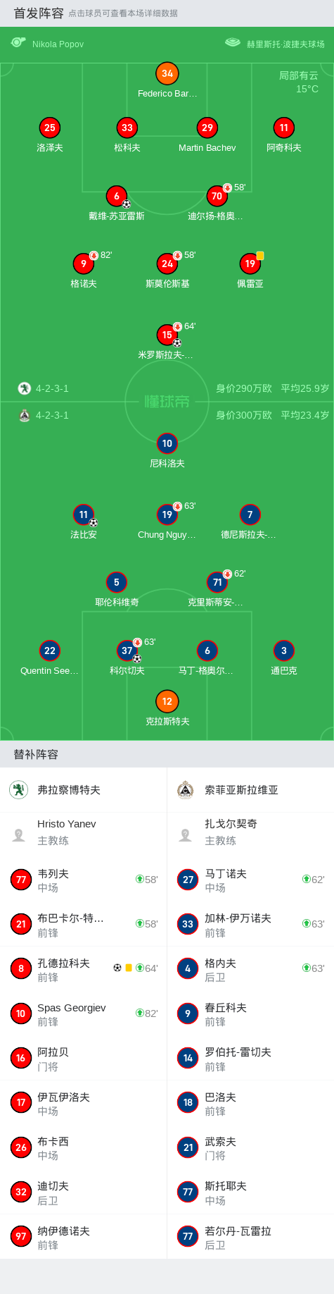 第32分钟,索菲亚斯拉维亚球员科尔切夫打入一球。