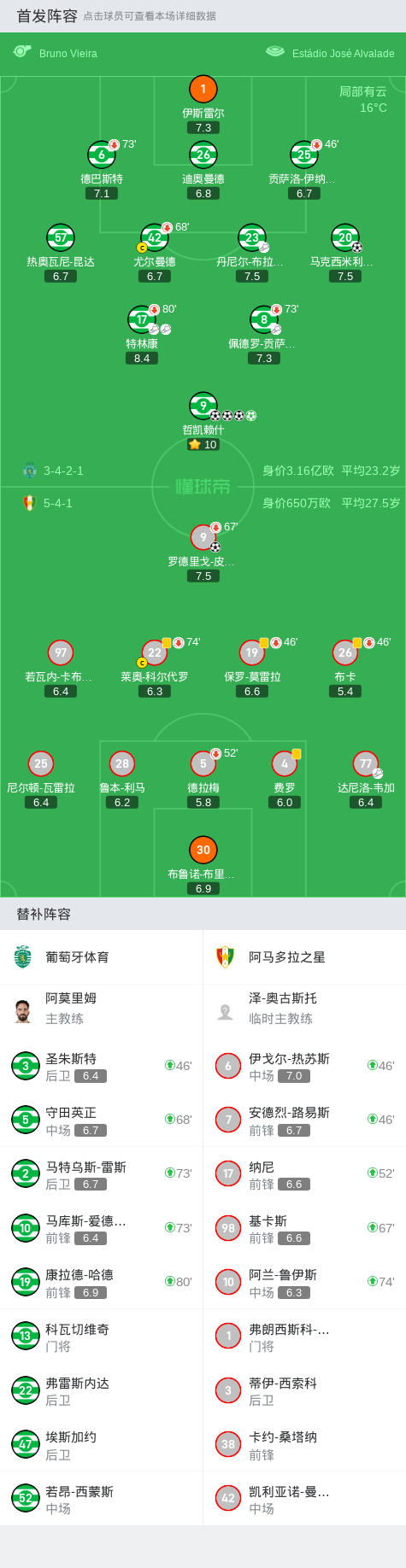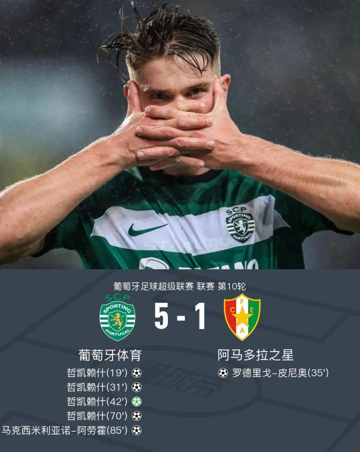 在葡萄牙足球超级联赛第10轮的较量中,葡萄牙体育坐镇主场迎战阿马多拉之星。上半场,佩德罗-贡萨尔维斯和特林康分别送上助攻,助哲凯赖什完成梅开二度。达尼洛-韦加送上助攻,罗德里戈-皮尼奥破门扳回一分。布卡门前手球送点,哲凯赖什操刀主罚一蹴而就,完成本场帽子戏法。下半场,罗德里戈-皮尼奥进球被吹无效。特林康再次助攻,哲凯赖什破门完成大四喜。丹尼尔-布拉干萨助攻,马克西米利亚诺-阿劳霍再下一城。最终葡萄牙体育主场5-1狂扫阿马多拉之星。