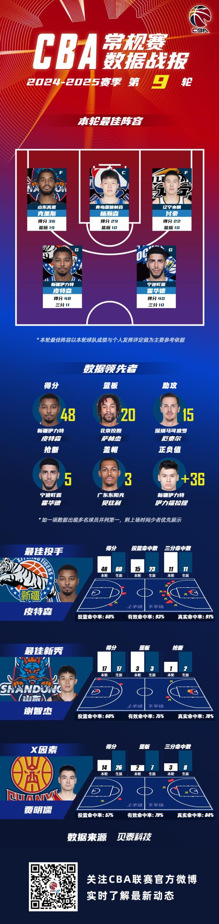 数据领先者方面,新疆伊力特球员皮特森以单场48分的数据领衔得分榜;