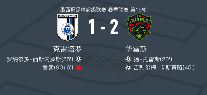 在墨西哥足球超级联赛春季联赛第15轮的较量中,克雷塔罗坐镇主场迎战华雷斯。比赛中,华雷斯的扬-托雷斯在队友霍纳坦-冈萨雷斯的助攻下率先破门,随后扬-托雷斯再次展现出色表现,为吉列尔梅-卡斯蒂略送出助攻,帮助球队再下一城。克雷塔罗方面,罗纳尔多-西斯内罗斯在奥马尔-门多萨的助攻下扳回一球。然而,比赛接近尾声时,克雷塔罗的鲁索被罚下场,最终华雷斯以2-1的比分在客场取得胜利。