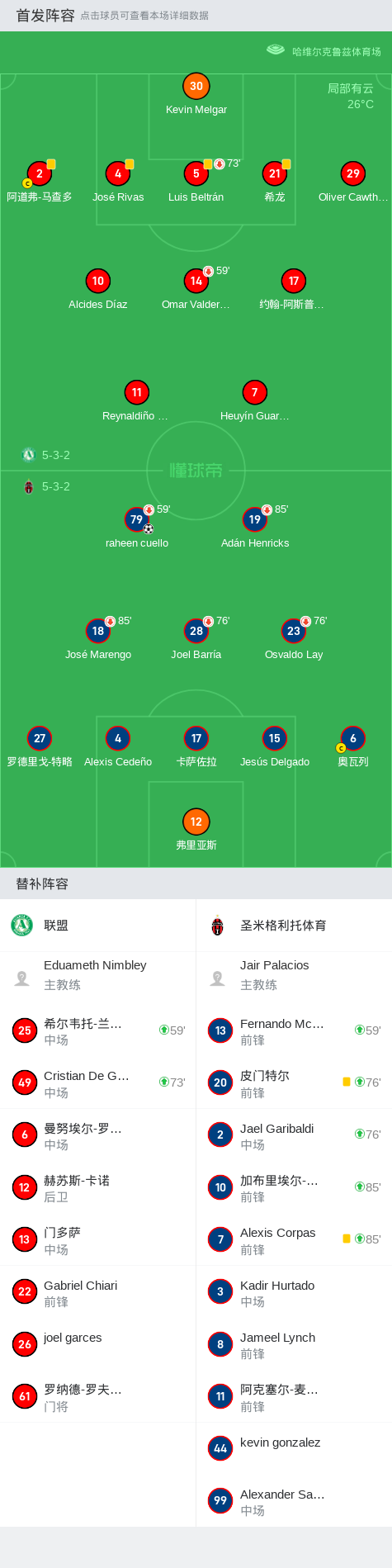 第54分钟,圣米格利托体育球员raheen cuello打入一球。