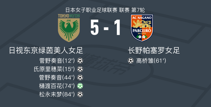 在日本女子职业足球联赛第7轮的较量中,日视东京绿茵美人女足与长野帕塞罗女足展开激烈对决。比赛中,菅野奏音表现出色,成功打入两球。山本柚月的精彩助攻帮助氏原里穗菜取得进球,而北村菜菜美也为菅野奏音的第二个进球贡献了助攻。樋渡百花在比赛中罚入点球,并在随后助攻松永未梦再下一城。长野帕塞罗女足方面,高桥雏在稻村雪乃的助攻下打入一球。最终,日视东京绿茵美人女足以5-1的比分战胜对手,取得胜利。