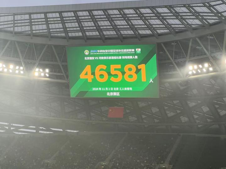 赛季收官战,国安vs河南现场观众为46581人ETChalmers @懂球帝2024-11-02 17:152024年中超收官战,北京国安主场对阵河南队,本场比赛现场观众为46581人。11月2日15:30,北京国安坐镇北京工人体育场迎战河南队,迎来球队本赛季最后一个主场比赛。据现场播报,本场比赛现场观众人数为46581人。截至发稿前,场上比分为1-1,北京国安凭借古加的进球取得领先,河南队由迈达纳破门扳平比分。展开更多