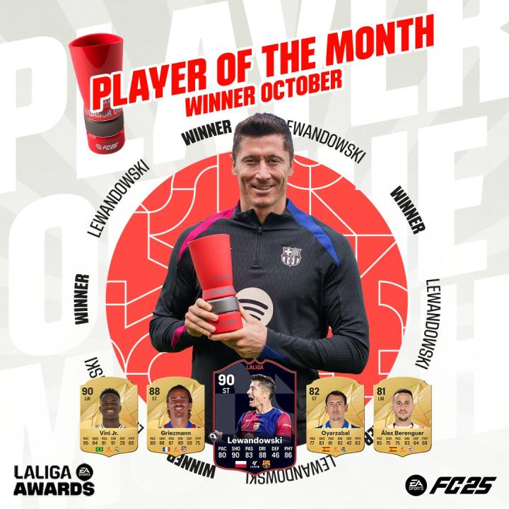 凭借着这样的表现,莱万在评选中击败了格列兹曼、维尼修斯、贝伦格尔和奥亚萨瓦尔,当选西甲十月份最佳球员。本周五,他领取了自己的奖杯。