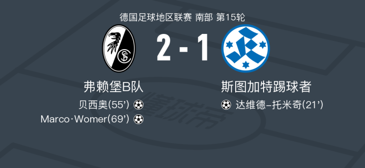 弗赖堡B队2-1逆转斯图加特踢球者,Marco·Womer、贝西奥破门