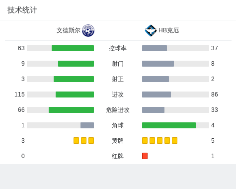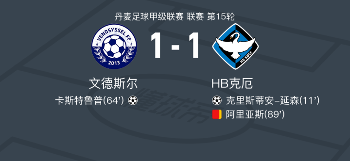 在丹麦足球甲级联赛第15轮的较量中,文德斯尔坐镇主场迎战HB克厄。比赛中,HB克厄的克里斯蒂安-延森在库尔哈奇的助攻下率先为球队取得进球。随后,文德斯尔的卡斯特鲁普在Oskar Öhlenschlaeger的助攻下扳平比分。比赛接近尾声时,HB克厄的阿里亚斯因累计两张黄牌被罚下。最终,双方以1-1握手言和。