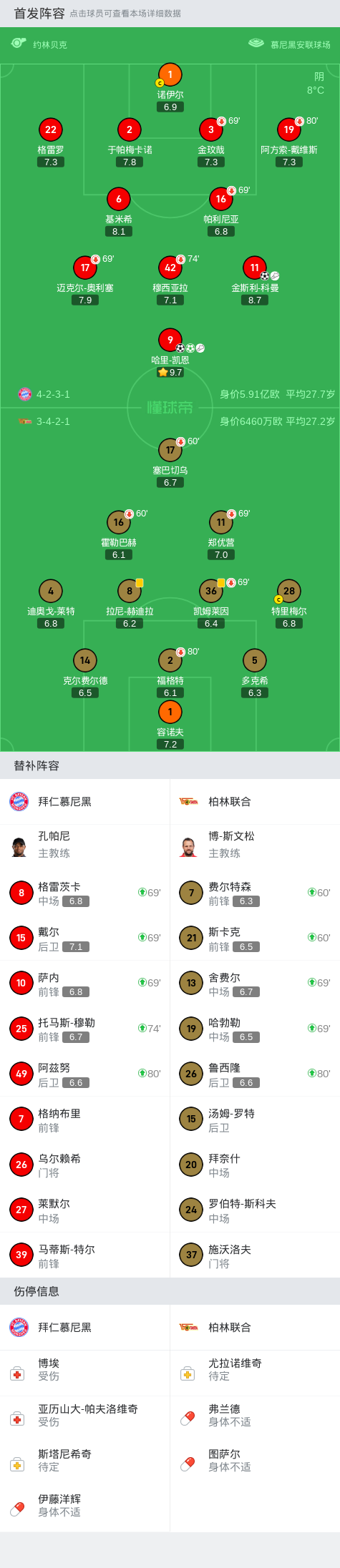 第68分钟,拜仁连换三人,格雷茨卡、戴尔、萨内出场