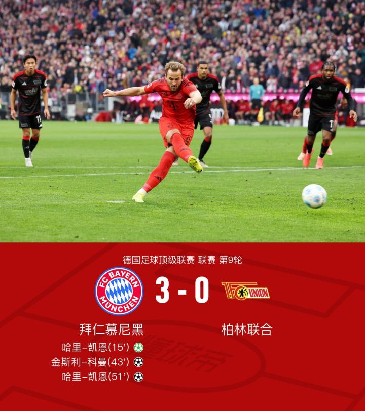 在德国足球顶级联赛第9轮的较量中,拜仁慕尼黑坐镇主场迎战柏林联合。上半场凯恩点射破门,科曼禁区小角度打门扩大比分,下半场凯恩禁区扫射梅开二度,科曼凌空打门被扑最终,拜仁慕尼黑以3-0的比分完胜柏林联合。