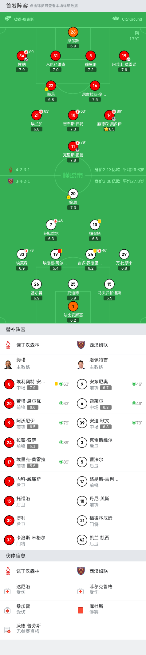 诺丁汉森林3-0十人西汉姆取三连胜,埃纳世界波,奥多伊破门