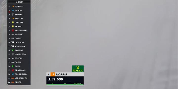 赛道的状况在不断演进,皮亚斯特里短暂登顶后,阿尔本、诺里斯先后刷新最快圈!